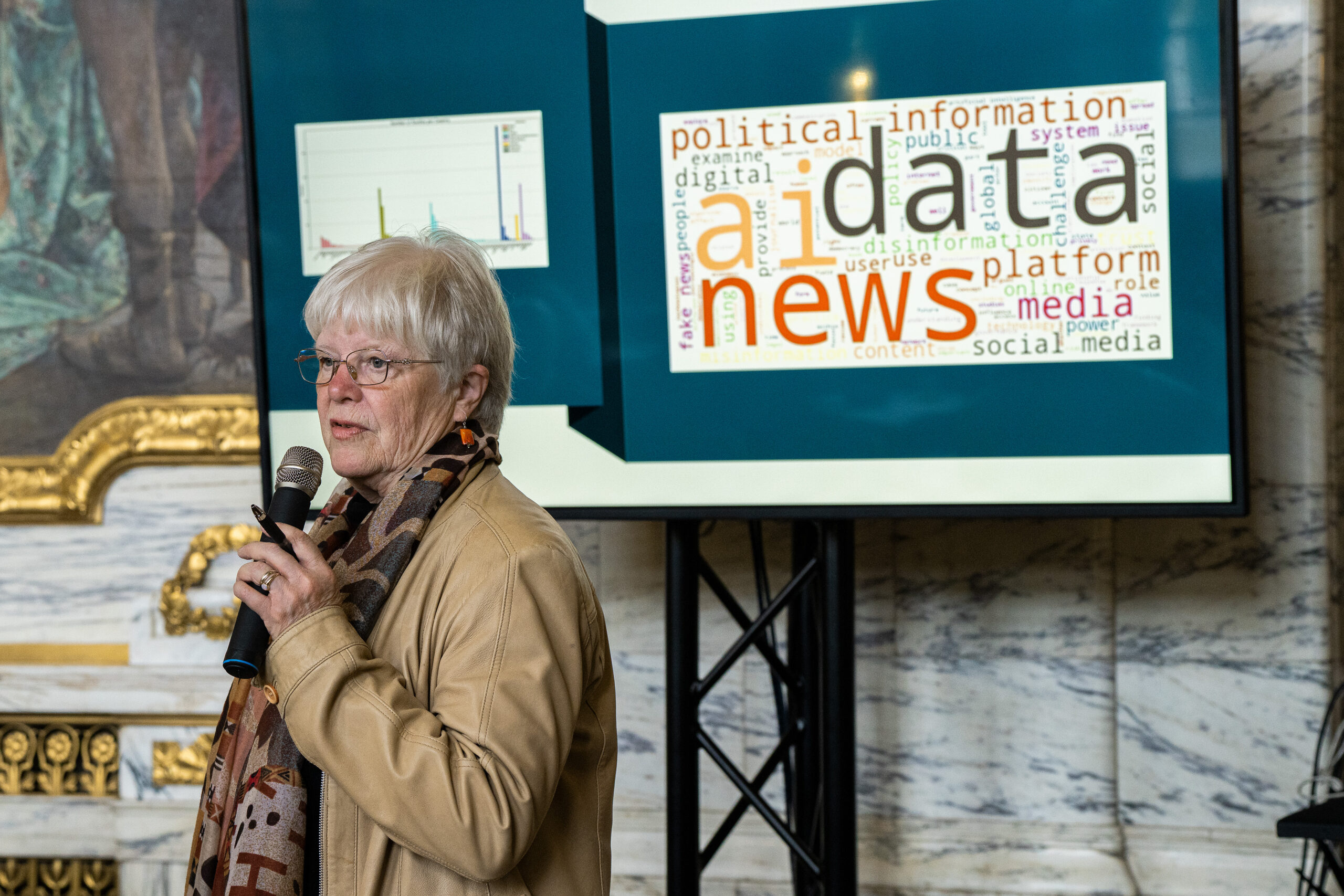 Professor Robin Mansell, Scientific Director of the Observatory first research cycle, followed with a high-level overview of the report. She traced the Observatory’s path from synthesising more than 3,000 sources and 1,600 citations across 84 countries, bringing together 400 experts and researchers, and building an interdisciplinary evidence base that connects media, AI, and data governance with the cross-cutting theme of disinformation.